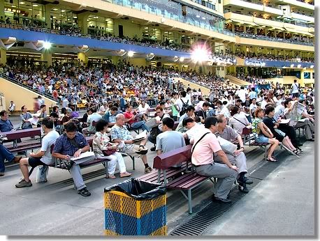 零五年六月馬季殺科改戰在跑馬地進行,而且免費入場。我抱著免費入場去影相的心態走進去,居然給我見到朋友與同事在賭馬,世界真細少啦。而且我亦相信,如果大家係有緣的話,就無論如何走到那裡都可以再見得到。相片為跑馬地馬場。